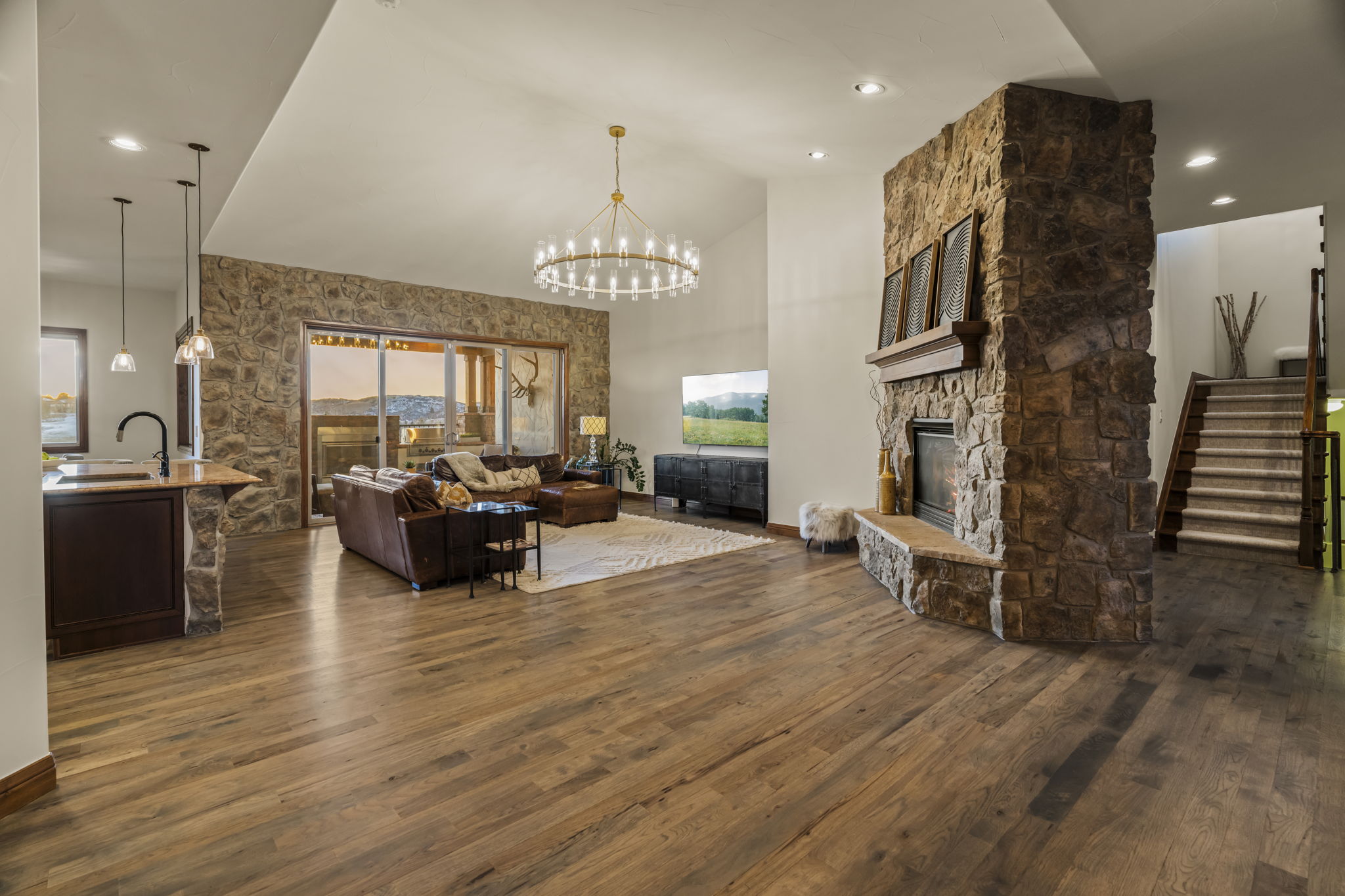 Expansive deck, outdoor kitchen, fire features, and hot tub overlooking the views.