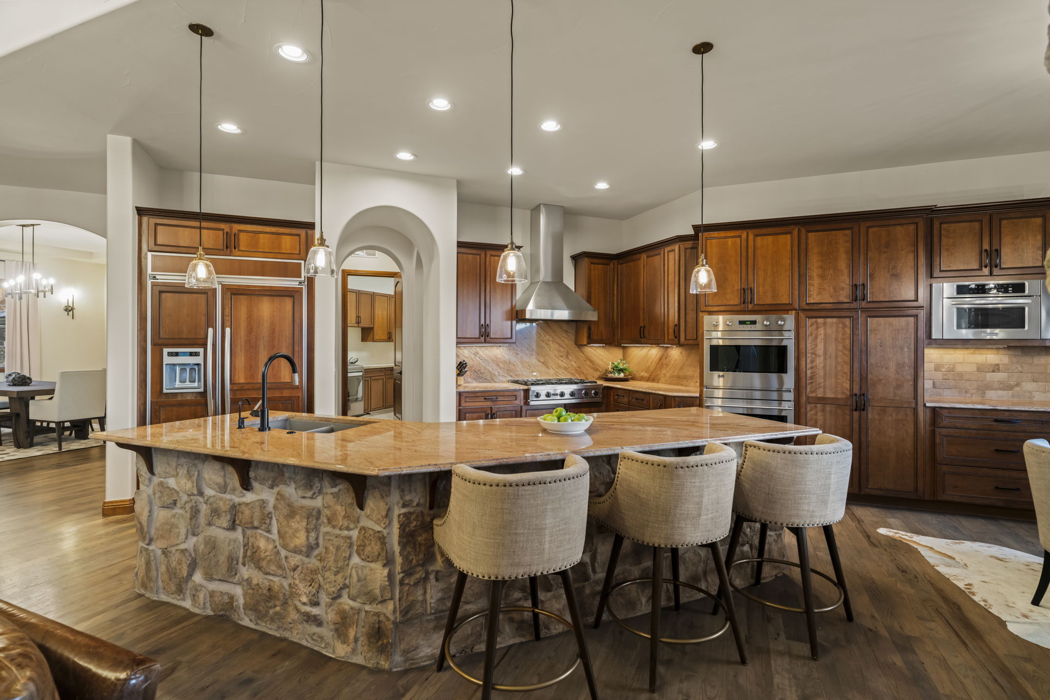 Custom stone details, Viking range, and cherry cabinetry designed to impress.